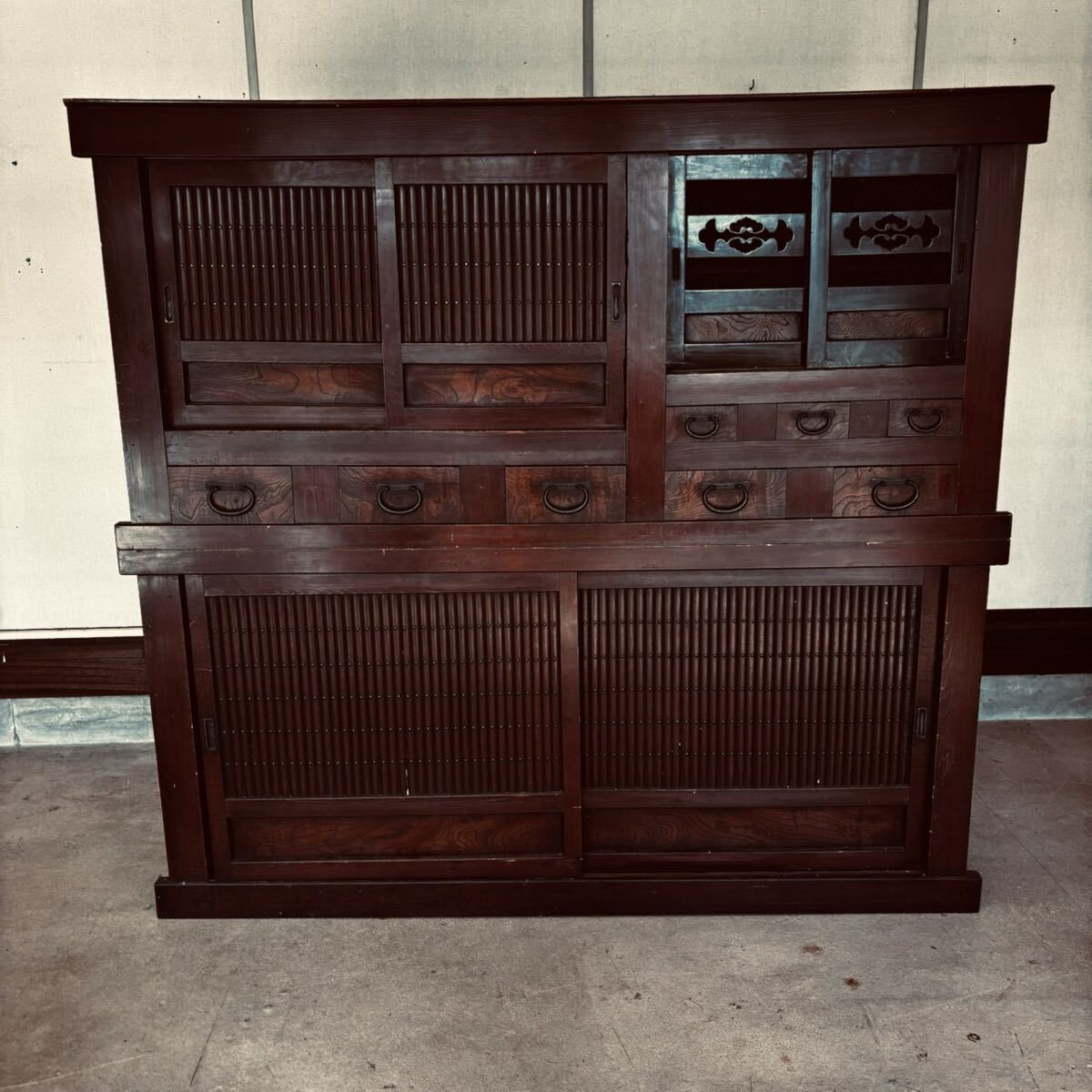 アンティーク調の水屋箪笥です。食器や茶器を収納するために使われていた戸棚になります。重厚なデザインで、引き戸や複数の引き出しが特徴的な和家具です。