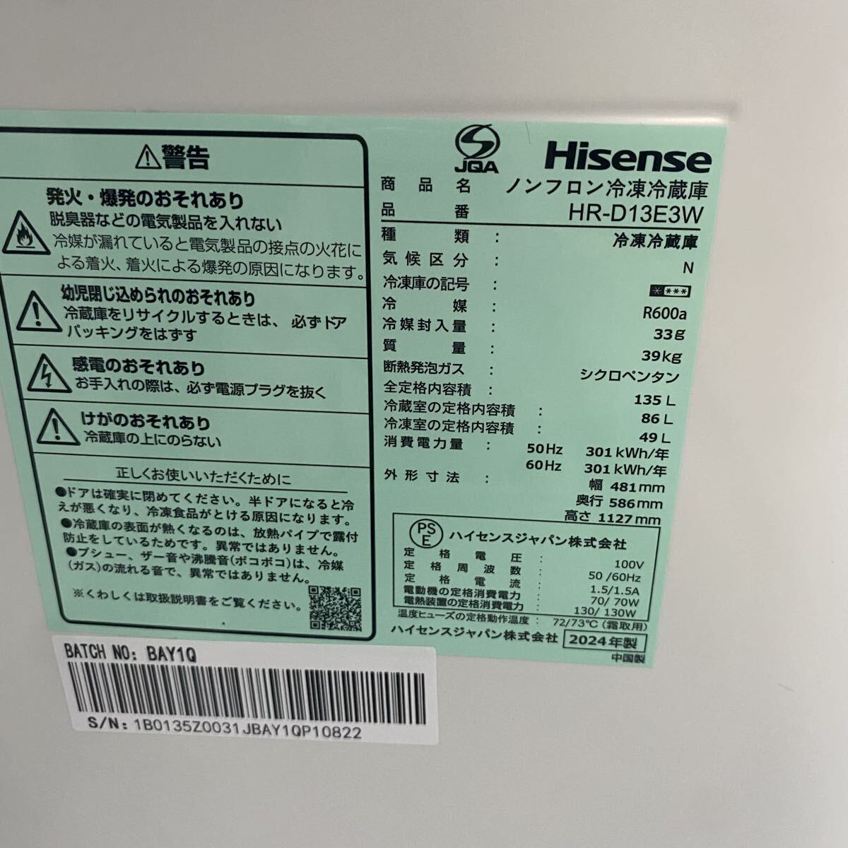 Hisense ハイセンス ノンフロン冷凍冷蔵庫 HR-D13E3W 2024年製 2ドア ホワイト引越しに伴い、お譲り致します。簡単な動作確認済み。清掃は行いましたが、取りきれない汚れがあります。※サイズが大きいため、熊本県宇城市近郊で直接引き取りが可能な方のみ購入をご検討ください。